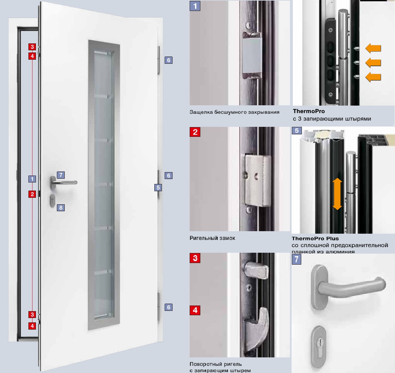 3. Вы и Ваша семья хотите чувствовать себя дома в безопасности, и мы позаботились о том, чтобы все двери ThermoPro были серийно оснащены замком с многоточечным запиранием. Двери ThermoPro оснащены со стороны петель тремя запирающими штырями. Двери ThermoPro Plus защищены от подваживания сплошной предохранительной планкой со стороны петель. Вам будет комфортно и безопасно у себя дома!
