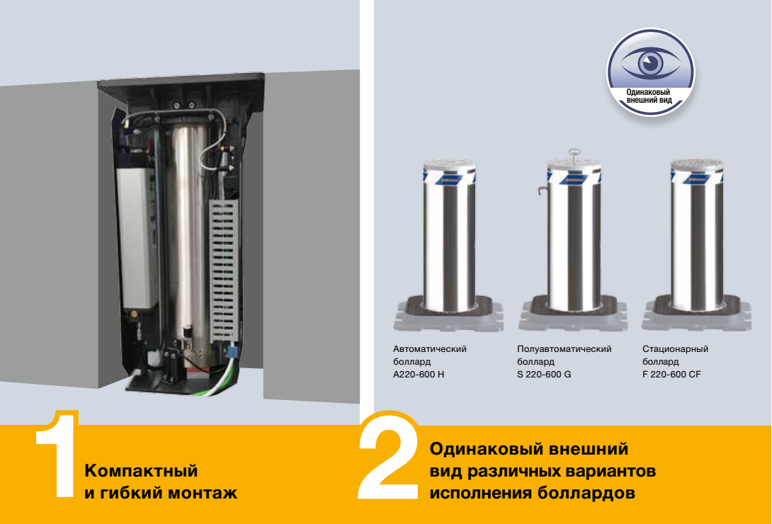2. Цилиндры всех боллардов выглядят одинаково,что позволяет произвольно комбинировать между собой болларды серий Security Line и High Security Line. Кроме того, неподвижные полуавтоматические и автоматические болларды можно прекрасно комбинировать друг с другом благодаря плите основания. Таким образом создается на 100 % гармоничный внешний вид.