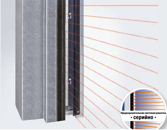 до 2500 мм контролирует зону закрывания ворот на всю её высоту. Таким образом, нет необходимости в предохранителе замыкающего контура. Световая решетка встраивается в направляющие, что дополнительно