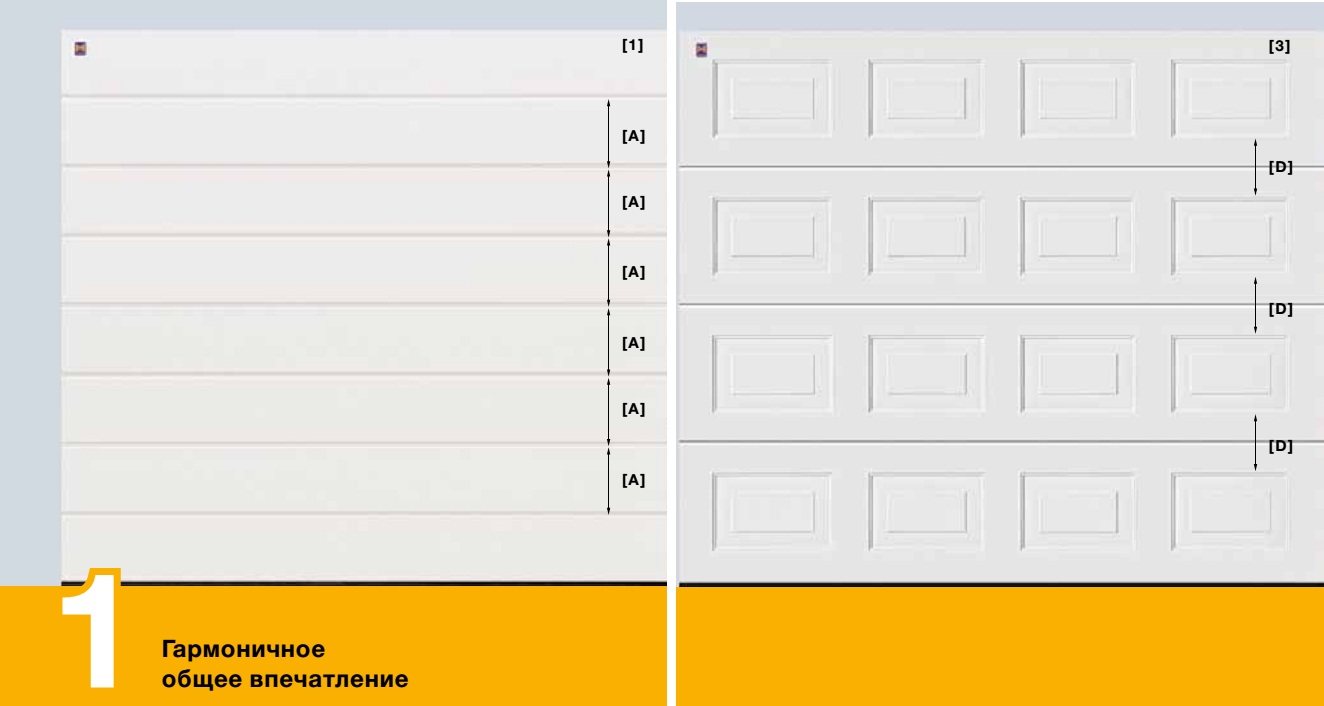 Для общего гармоничного вида компания Hörmann предлагает секционные ворота, у которых расстояния между отдельными кассетами [D ] по высоте абсолютно одинаковые. Высота секций равномерно распределена по всей высоте ворот. Также
