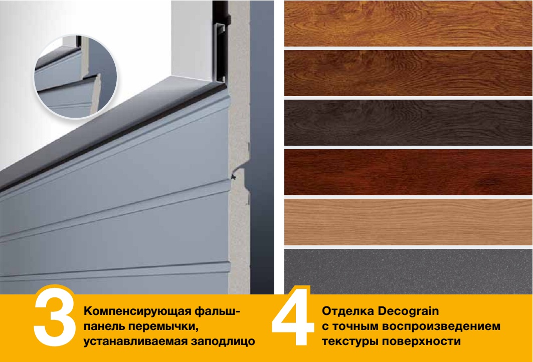 Для секционных ворот с цветным покрытием и для ворот с отделкой поверхности Decograin дополнительно поставляется облицовка