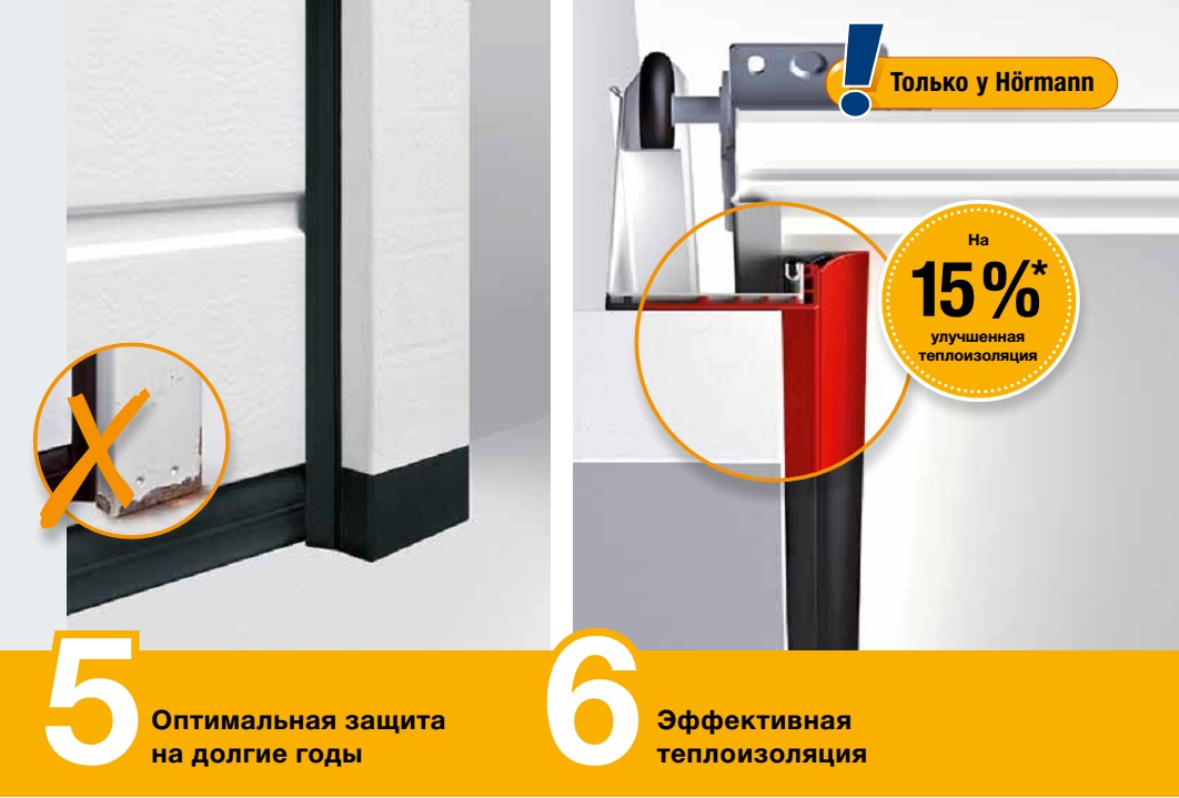 термическое разделение между рамой направляющих и кирпичной стеной, и улучшает тем самым теплоизоляцию на 15 %*. В качестве опции Вы можете заказать уплотнительную прокладку ThermoFrame для всех секционных ворот Hörmann.