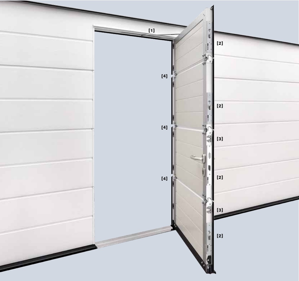 Готовый к монтажу дверной элемент Боковые двери Hörmann поставляются в состоянии, готовом к монтажу, и оснащены врезным замком с профильным цилиндром, гарнитуром нажимных ручек с закругленными концами и овальными розетками, а также регулируемыми в трех плоскостях дверными петлями. Рама дверного полотна выполнена из погодоустойчивых алюминиевых профилей (строительная глубина 60 мм) и уплотнена по всему периметру.